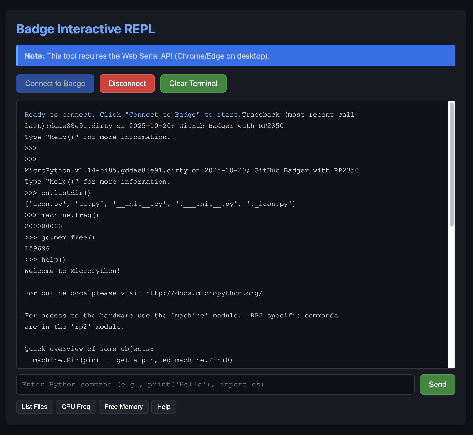 Badge Interactive REPL. Note: This tool requires the Web Serial API (Chrome/Edge on desktop). Connect to Badge, Disconnect and Clear Terminal buttons. Then a REPL interface displaying: Ready to connect. Click "Connect to Badge" to start.Traceback (most recent call last):ddae88e91.dirty on 2025-10-20; GitHub Badger with RP2350 Type "help()" for more information. >>> MicroPython v1.14-5485.gddae88e91.dirty on 2025-10-20; GitHub Badger with RP2350 Type "help()" for more information. >>> os.listdir() ['icon.py', 'ui.py', 'init.py', '._init.py', '._icon.py'] >>> machine.freq() 200000000 >>> gc.mem_free() 159696 >>> help() Welcome to MicroPython! |